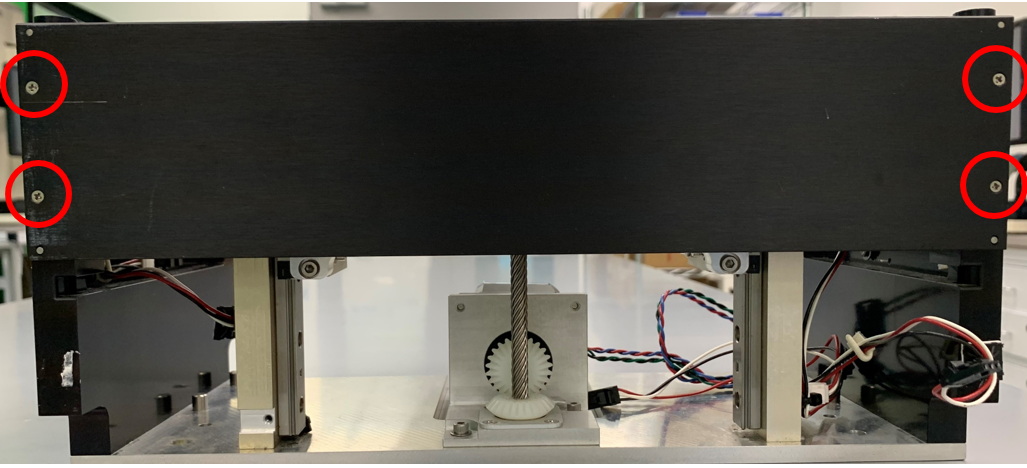 - Carefully raise the magnet assembly by hand. To do this, pull up on the magnet holder while turning the white gear manually. Raise the magnets until the top of the magnets are even with the top of the heaters on the Gort board (Heater Block) sub-assembly.