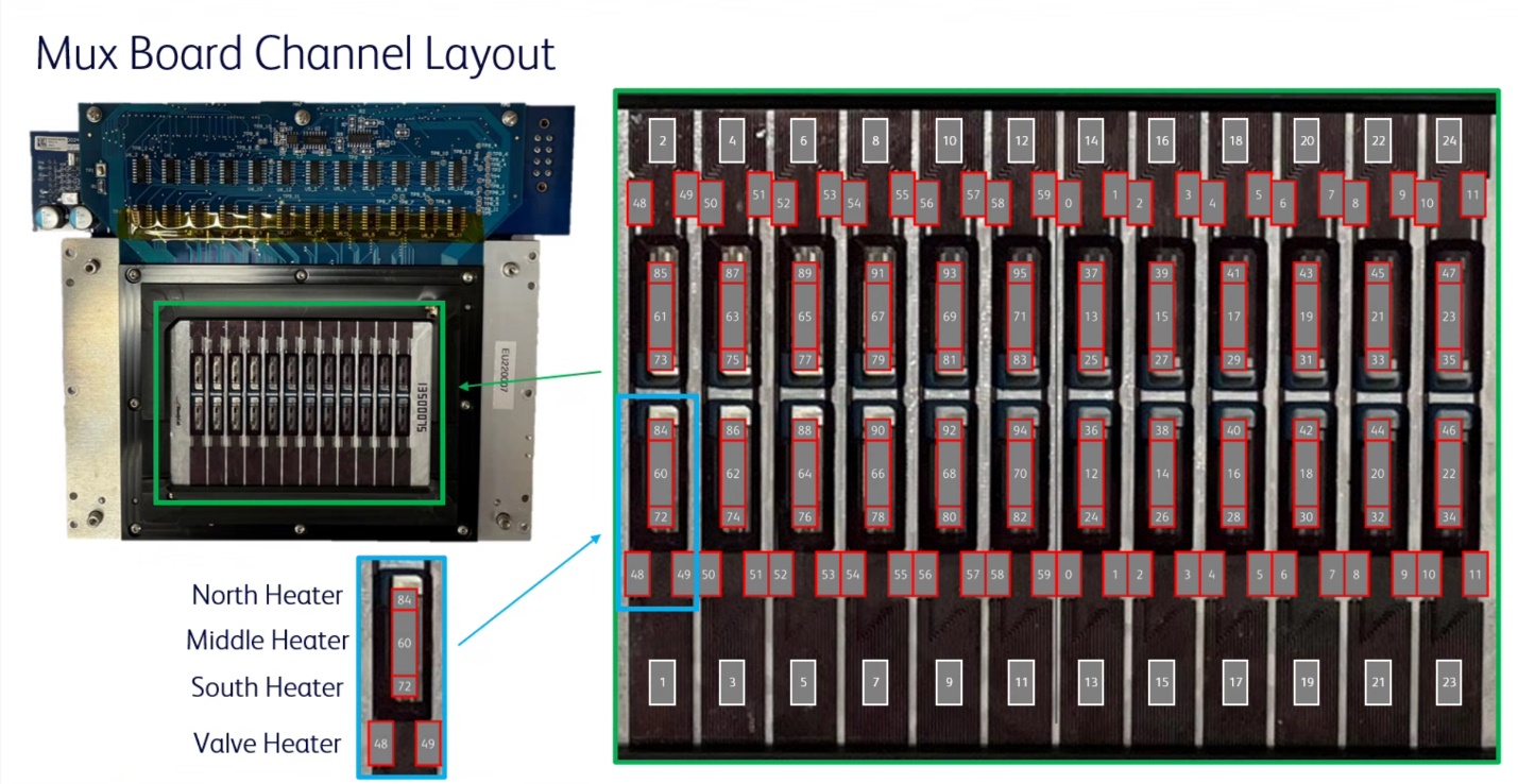 In the selftest.script output, the heaters are numbered based on the type of heater and location. The north, middle, and south heaters are responsible for heating the sample in the PCR cartridge. The valve heaters melt the wax deposits to seal the microfluidic channels on both sides.